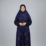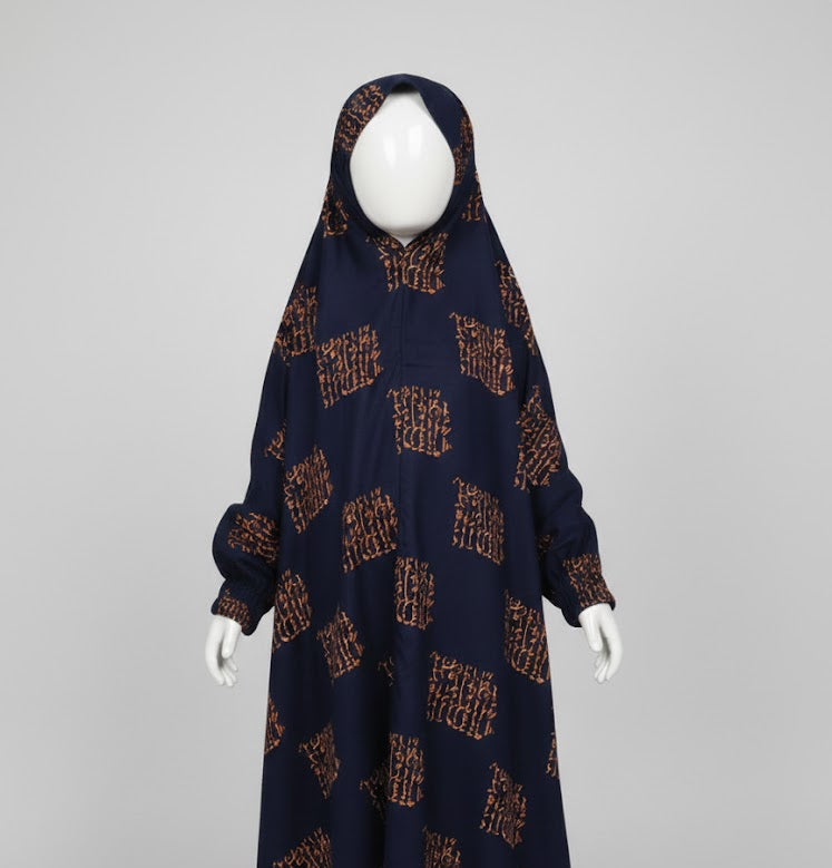 Kids Namaz Chadar With Sleeves (Age 6-11 years) - Navy Blue With Brown Flowers